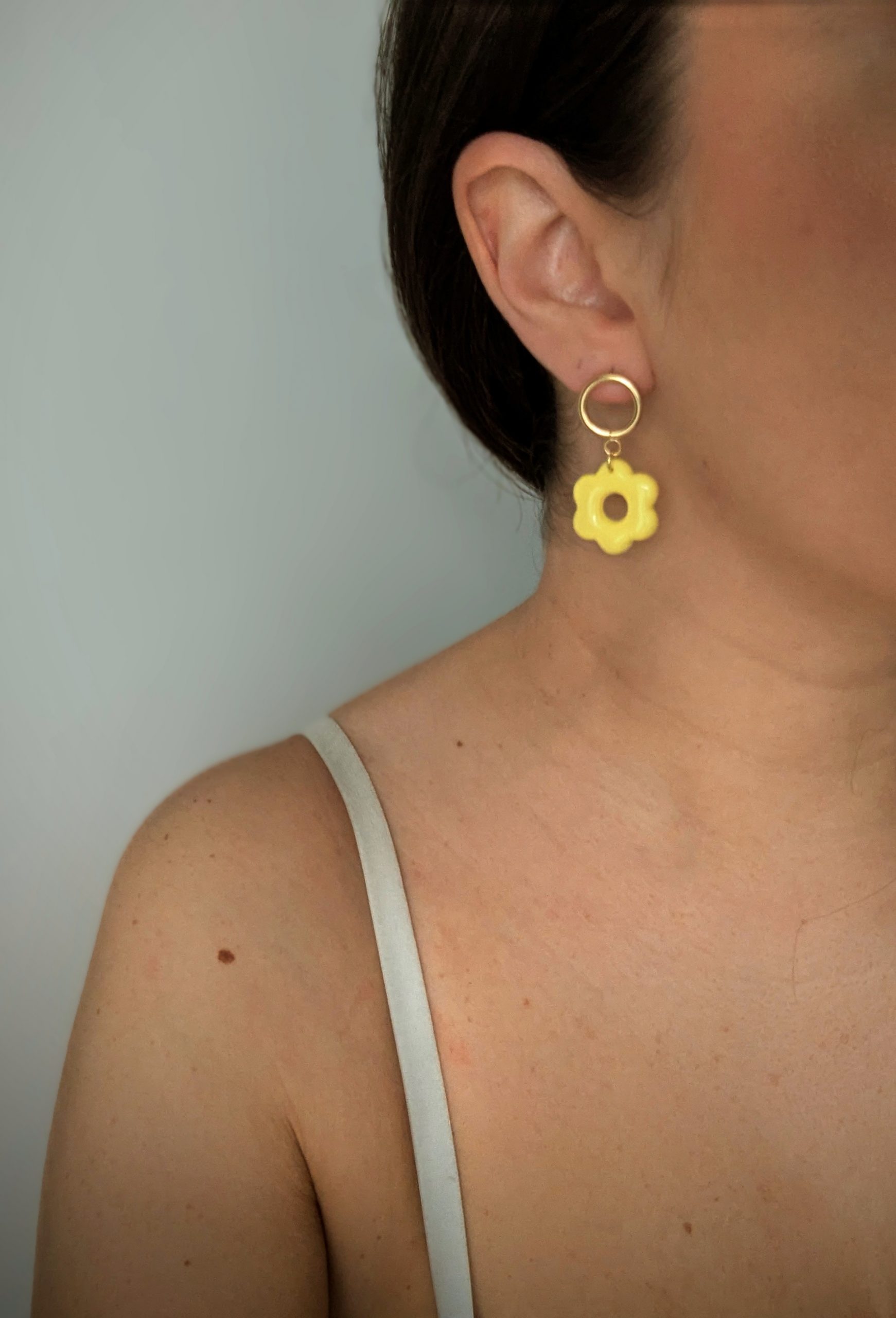 Ces boucles d’oreilles dorées, chacune ornée d’une délicate fleur jaune, ajoutent une touche vibrante et élégante à votre look, idéales pour illuminer vos tenues avec fraîcheur et originalité.